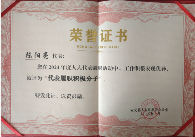 我司總經理陳陽亮在2024年人大代表履職活動中,工作積極表現優異,被評委“代表履職積極分子”。