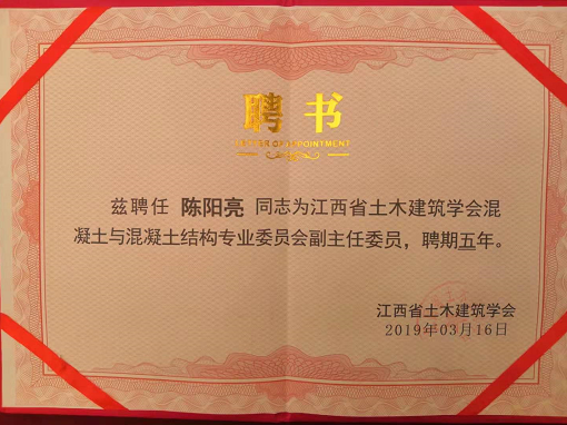 本次會(huì)議還對(duì)本屆主任委員、副主任委員頒發(fā)了聘書,聘期為五年,我司總經(jīng)理陳陽(yáng)亮先生也被聘為江西省土木建筑學(xué)會(huì)混凝土與混凝土結(jié)構(gòu)專業(yè)委員副主任委員之一。
