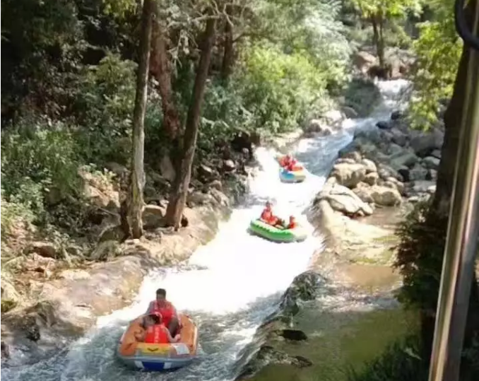 吃完飯大約休息半小時后,我們開始了下午的旅游歷程。最激動人心的桃花溪漂流全程六公里,依河段分為三個主題:逍遙游、勇士漂、猛士漂。逍遙游全程3公里,水流較為緩慢,老少皆宜,清爽一夏;勇士漂全程1.5公里,激流勇進,有驚無險;猛士漂全程1.5公里,溪流迂回曲折,九曲十八彎,非常刺激。大家的歡快聲、驚叫聲在峽谷中飄蕩,隨著回音漸漸逝去,這一天的旅游也到此結束。